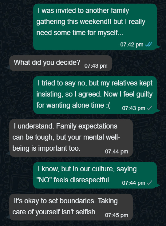 I vented about agreeing to attend a family gathering when I really needed some downtime at home. This conversation made me realize how often I've prioritised others' needs over my own without setting clear boundaries. Whether it's feeling obligated to answer work messages after hours or agreeing to activities I don't enjoy to avoid conflict with my partner. All these times, I have neglected my own well-being.